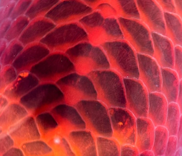 I was able to take a very close look at some koi, studied their patterns and they way they interact with scales, and I've learnt about the many possible variations that exist. Koi breeders don't just select for patterns, colors and scale quality, but there are also different ways in which the pattern shows up on the scale; sometimes pigments are stronger on th edge of a scale, sometimes it's the other way around. The interaction of pigments and scales can be really beautiful.